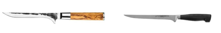 Een uitbeenmes (linker afbeelding) heeft een flexibel lemmet en is ideaal voor het verwijderen van botten, huid en bindweefsel van vlees. Een fileermes (rechter afbeelding) is vergelijkbaar maar nog flexibeler, ontworpen voor het fileren van vis.